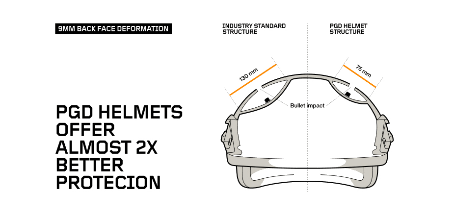 Na obrázku môžete vidieť, o koľko menšia je deformovaná plocha pri zásahu strelou v prilbe PGD Arch v porovnaní so štandardnými balistickými prilbami: