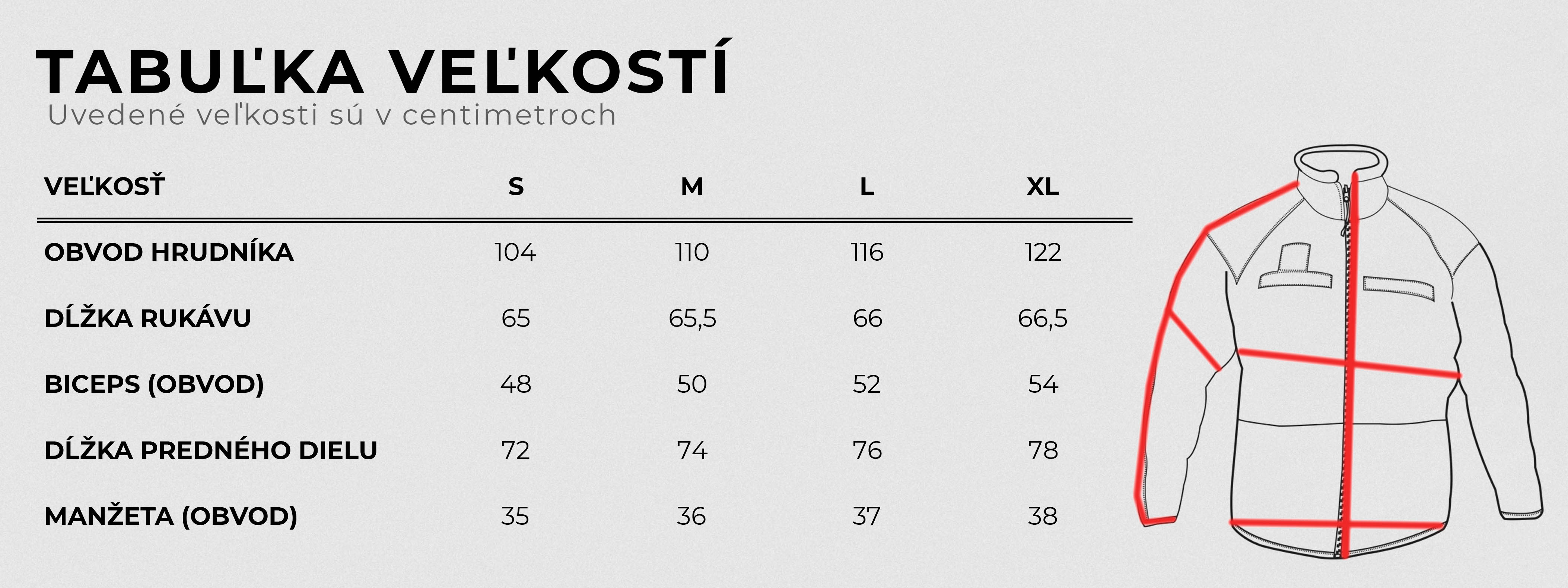 Sieťované panely v podpazuší zabezpečujú lepšiu priedušnosť. Na bicepsoch sú vrecká na zips s velcro panelmi. Manžety sú nastaviteľné so zapínaním na suchý zips.