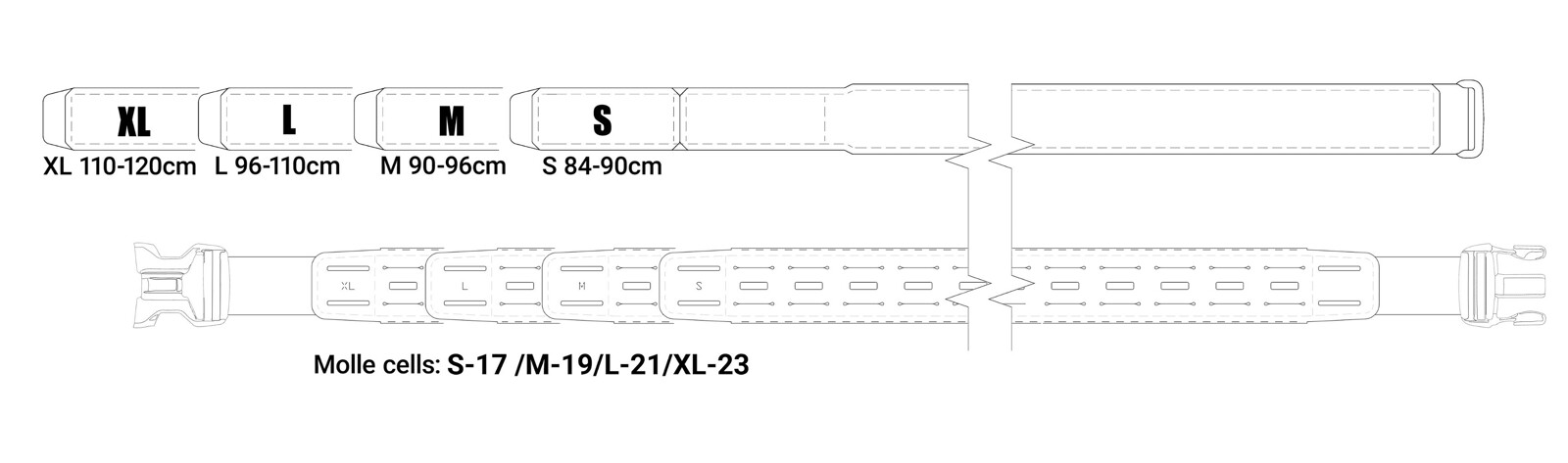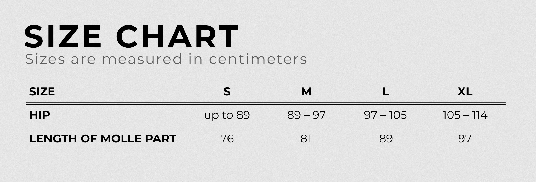 Always measure the belt at the spot where you actually wear it (whether higher on the waist or lower on the hips). In the size chart, you will find both the total length of the belt and the length of the MOLLE section. We recommend using a tailor’s tape measure – place it around the spot where you wear the belt and compare where the MOLLE section of the chosen size begins and ends.