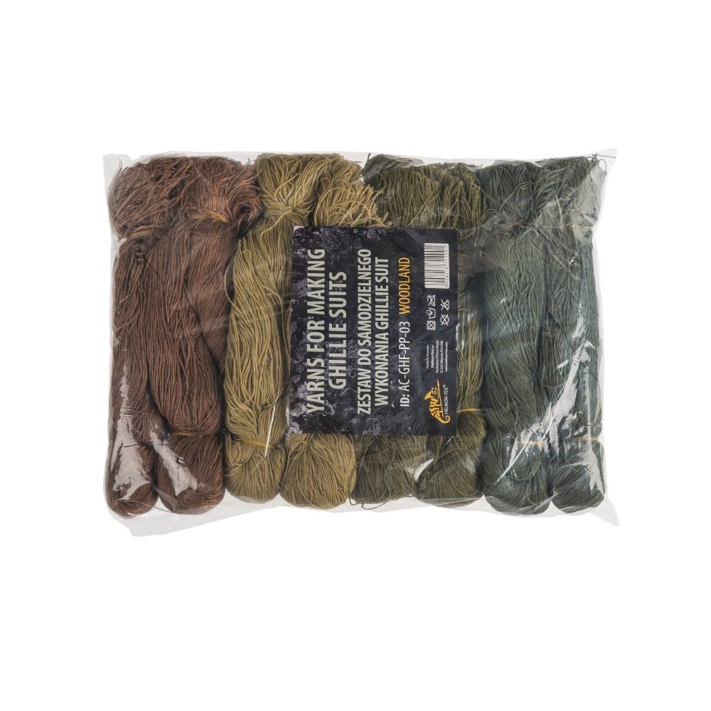 Use of several sets gives enough camouflage material to build a complete Ghillie suit on an appropriate base. The colors selection allows preparation of a perfect camouflage in most of the woodland terrains. Polyester yarns are less flammable than a natural burlap, don't fade, don't absorb moisture, nor build up smell or mildew.