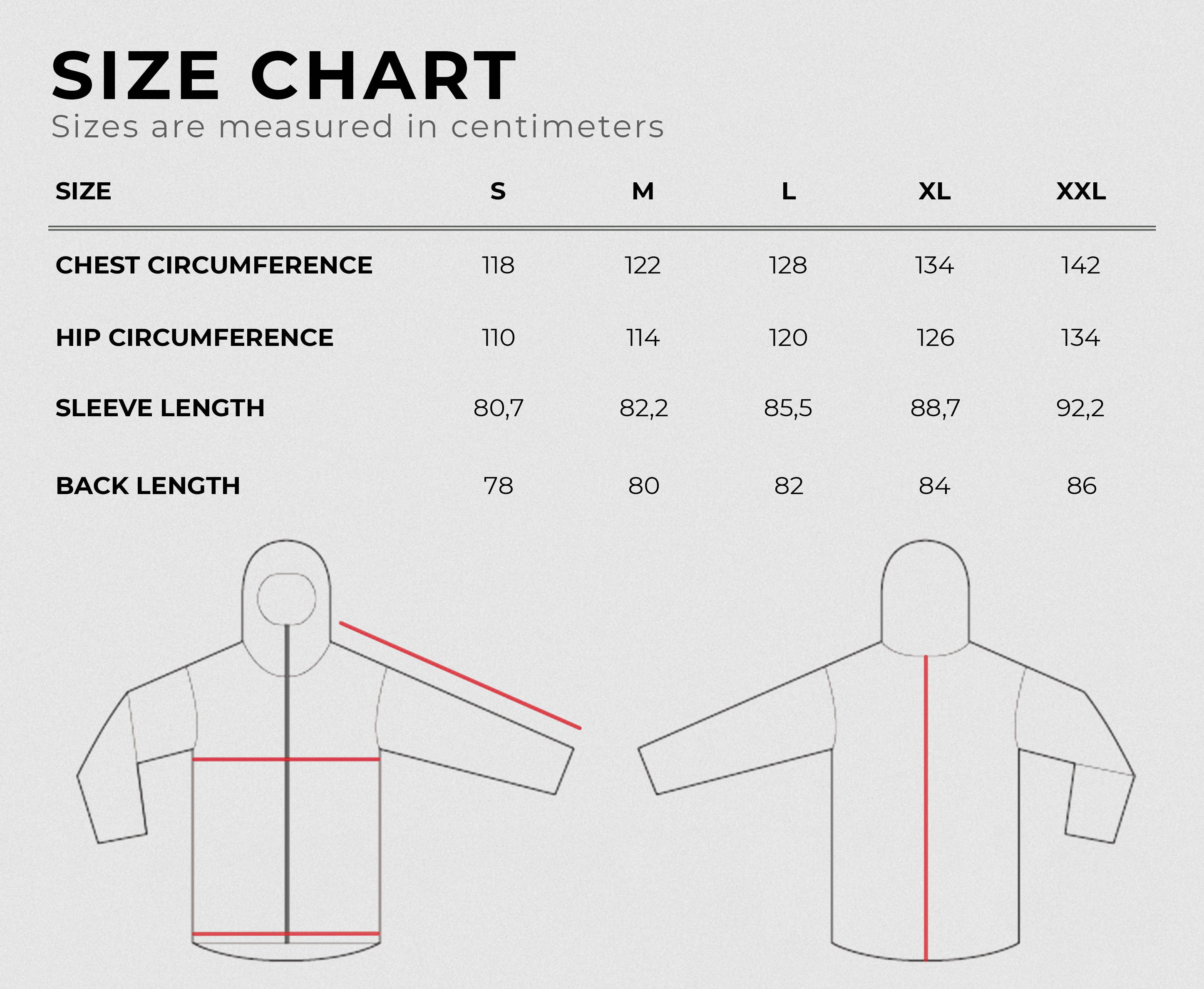 * The jacket is photographed in size M on a person 187 cm tall with a chest circumference of 102 cm.