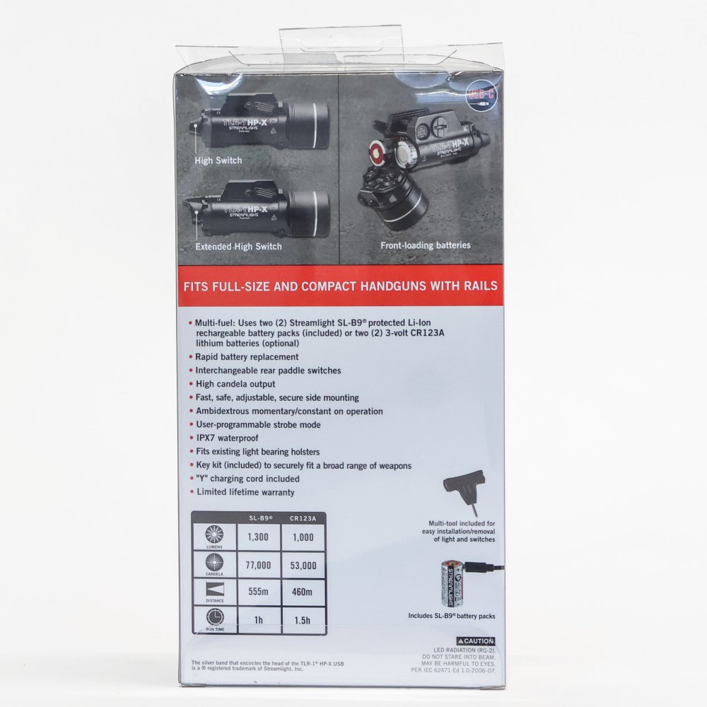 The Streamlight TLR-1 HP-X USB is a professional-grade tactical weapon light designed for high performance and reliability. Featuring multi-fuel capability, it runs on either rechargeable SL-B9 Li-Ion which are included in the package batteries or standard CR123A batteries. Its 6000-series aircraft aluminium body with black anodized finish ensures rugged durability, while the IPX7 waterproof rating makes it suitable for harsh conditions.