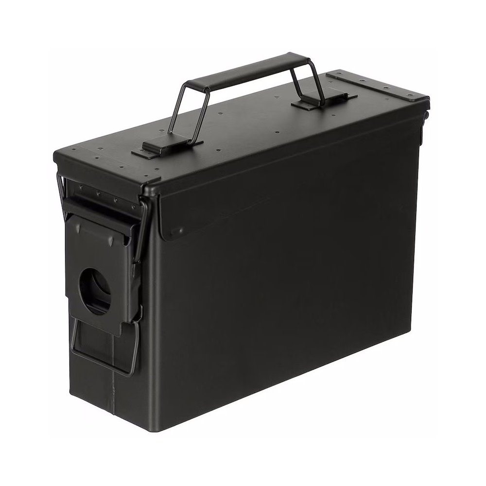 A practical reproduction of the US ammo box by Mil-Tex. Made from durable DC01 steel with a secure side locking mechanism and a comfortable carrying handle. Ideal as ammo vox, toolbox or storage container.