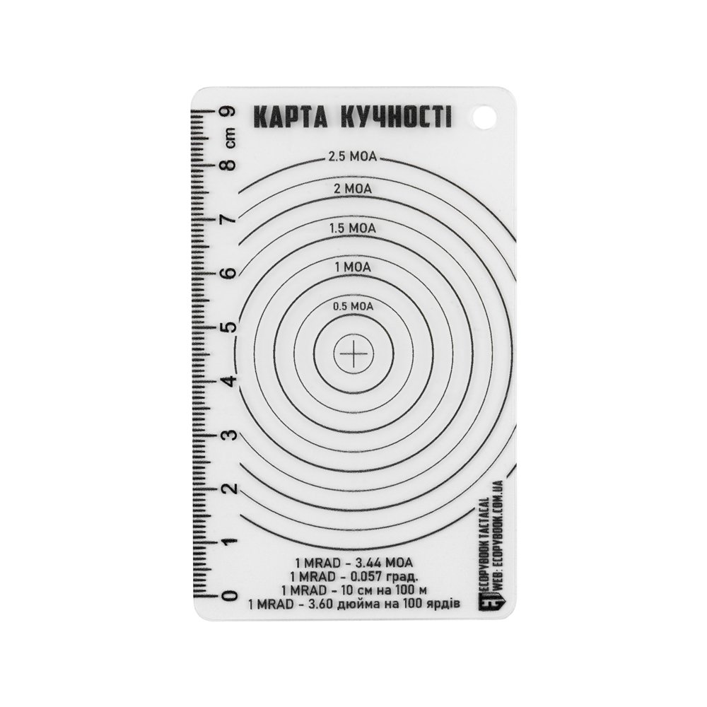 Ecopybook Tactical Accuracy Shot Chart is a compact pocket ruler for estimating shooting accuracy and quick visual measurements. Made from a transparent, flexible polymer with a matte anti-reflective finish, it minimises glare while remaining durable for field use. Its small size makes it easy to store in a pocket or bag without adding bulk.