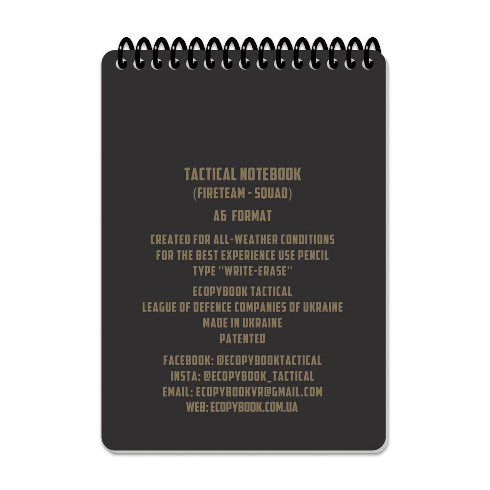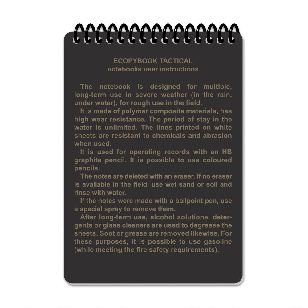 This notebook is ideal for professionals – soldiers, rescuers, tactical operators – as well as outdoor enthusiasts. You can write with a standard pencil and erase with a rubber eraser, wet sand, or dirt, and then rinse with water. For long-term use, we recommend regular cleaning with alcohol-based solutions or glass cleaners.