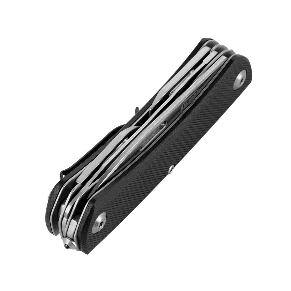 The handle is made from G10, a high strength composite material known for its durability, low weight and resistance to wear. The blade is made from D2 tool steel, offering good wear resistance and long edge retention. Other components are made from 420 stainless steel, which provides corrosion resistance and easy maintenance.