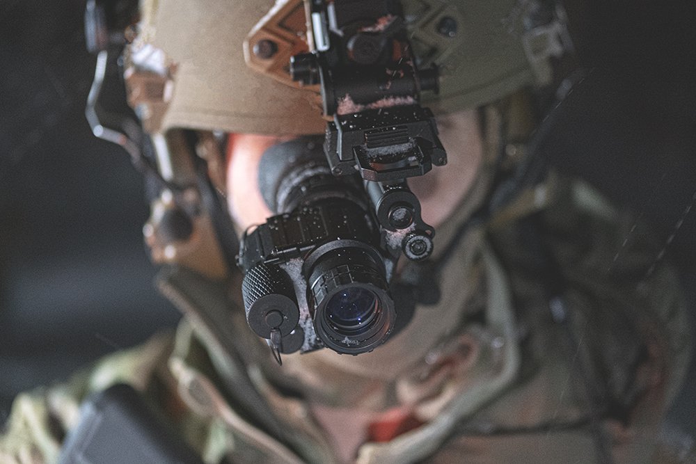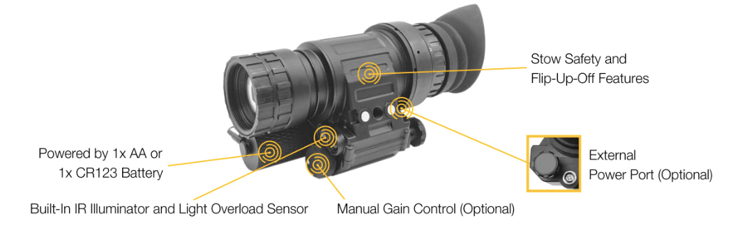 PVS-14C používa 27 mm objektív s clonovým číslom f/1,2 a zorným poľom (FOV) 40°.