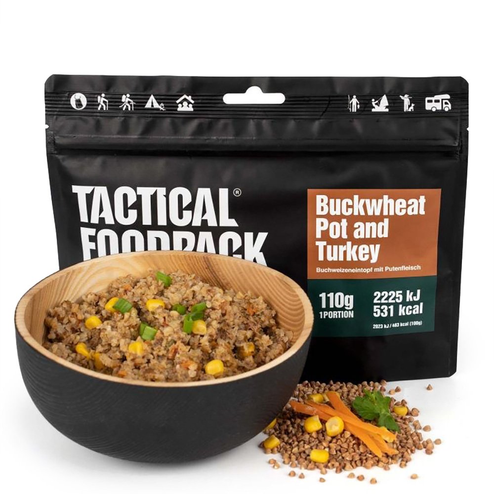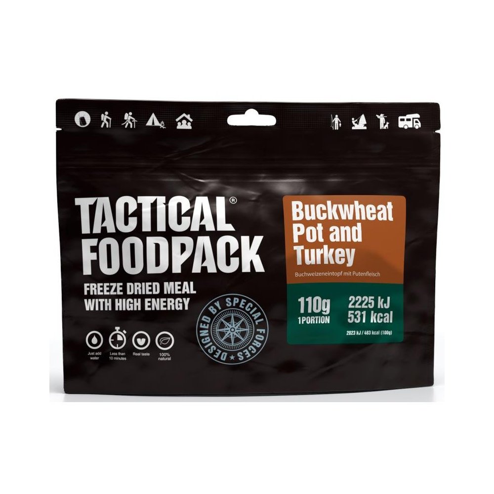 Tactical Foodpack Buckwheat Pot and Turkey je výživné, bezlepkové jedlo s vysokou energetickou hodnotou, navrhnuté pre náročné podmienky v teréne. Ideálne pre turistiku, výcvik, evakuačné balíčky alebo krízové situácie. Vďaka technológii mrazom sušenia si pokrm zachováva vitamíny, minerály a plnú chuť čerstvo pripraveného jedla.