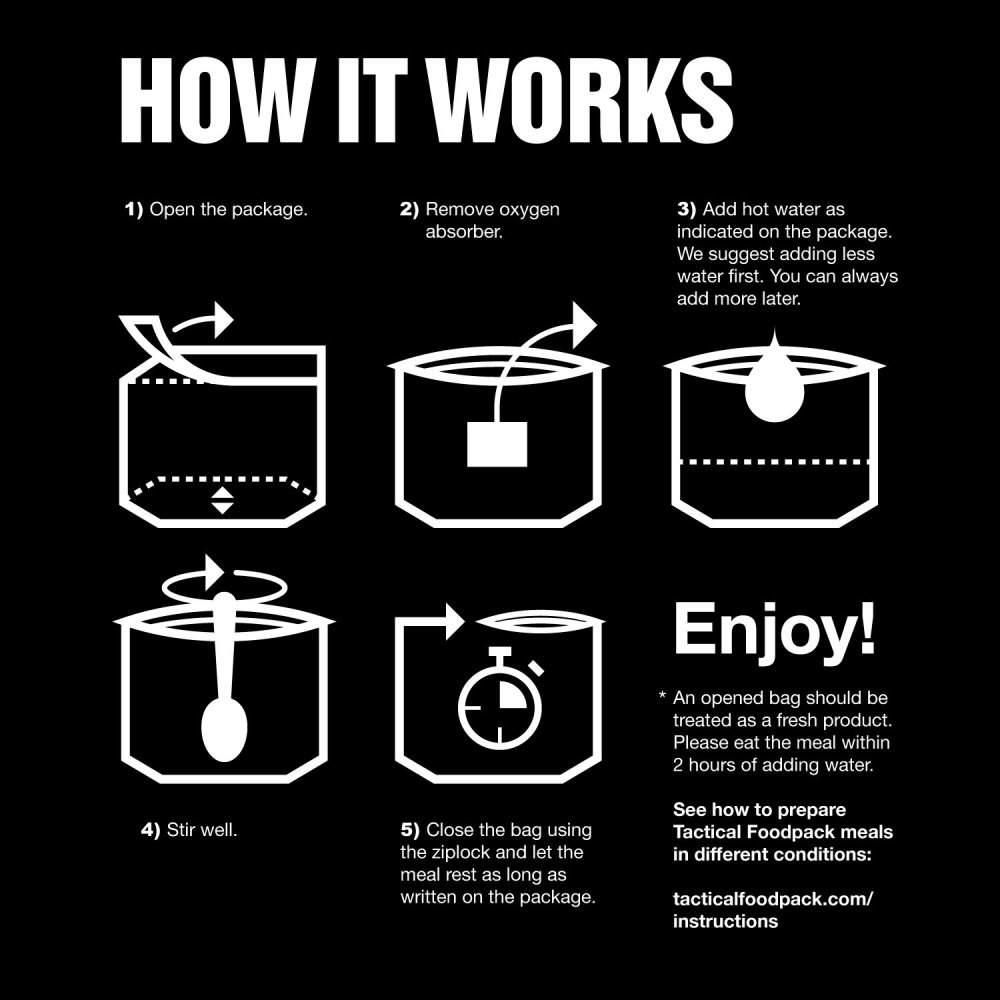 Nízka hmotnosť, kompaktné rozmery a jednoduchá príprava z neho robia skvelú voľbu pre expedície aj pre domácu krízovú zásobu. Teplé, plnohodnotné jedlo v ťažkej situácii výrazne zlepšuje morálku a výkonnosť – čo často rozhoduje.