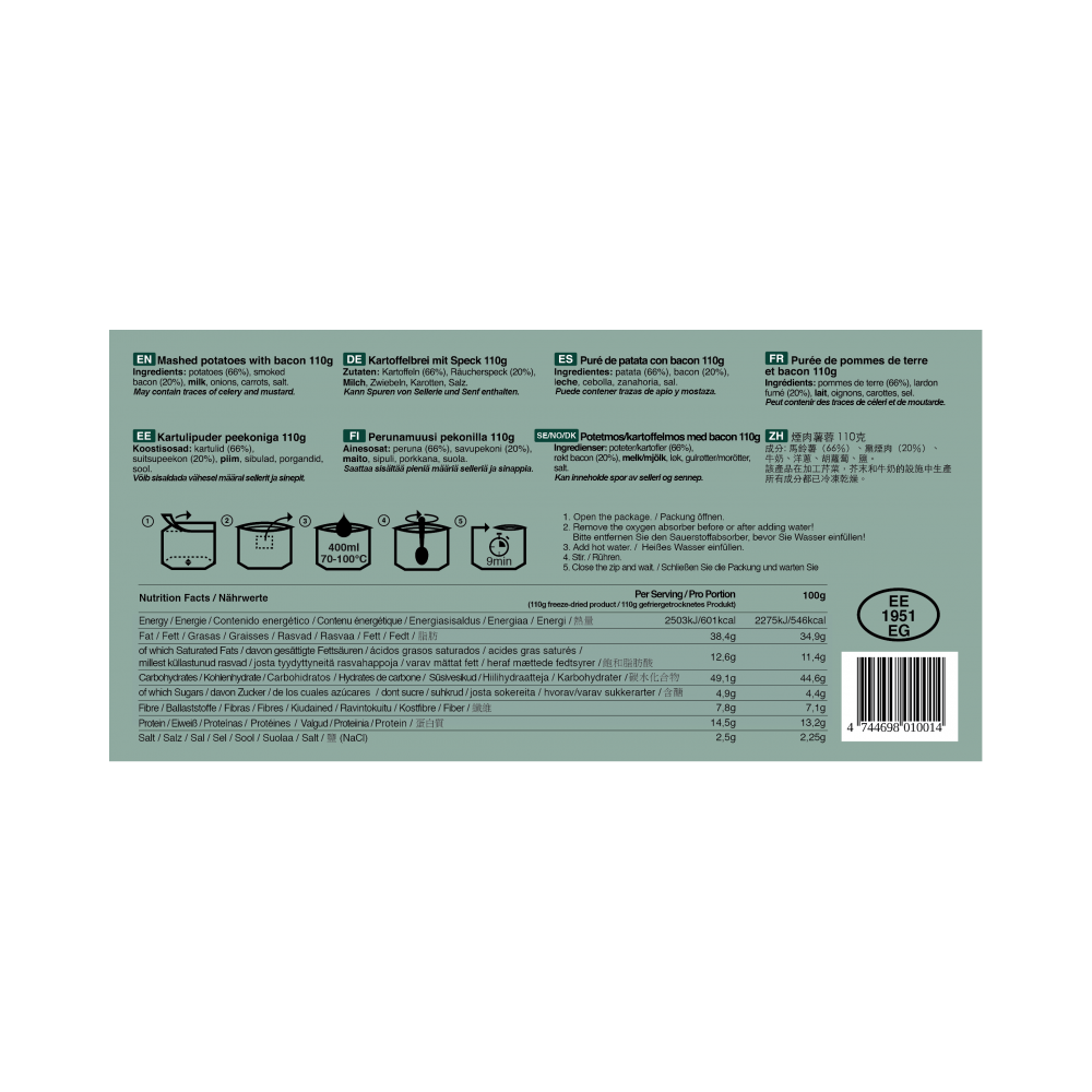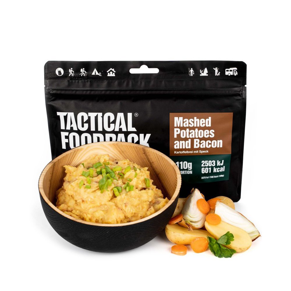 Tactical Foodpack Mashed Potatoes and Bacon je sýte a chutné jedlo s vysokou energetickou hodnotou, ideálne pre krízové situácie, túry, prežitie alebo výcvik. Vďaka lyofilizácii si jedlo zachováva plnú chuť a výživové hodnoty pri minimálnej hmotnosti a objeme – kľúčová výhoda pre každého, kto sa spolieha na efektívnu výbavu.