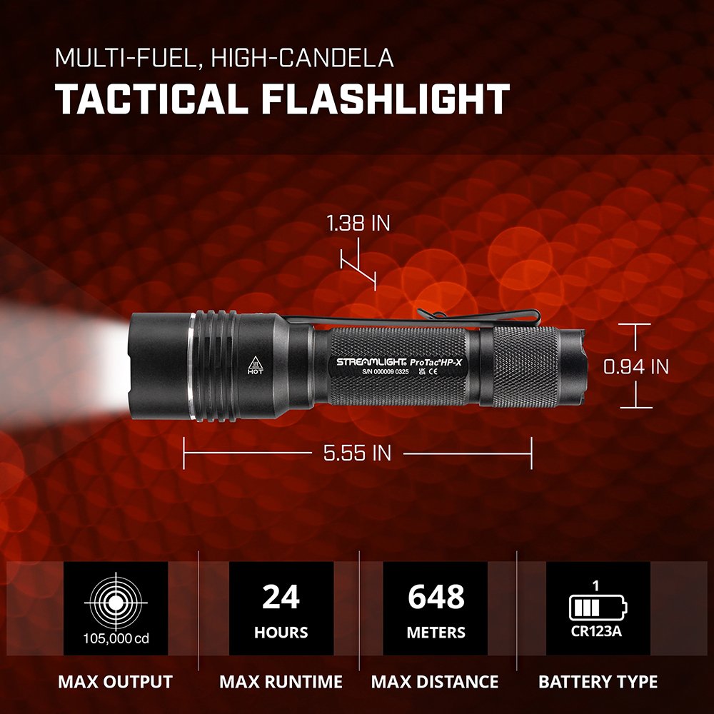 Streamlight ProTac HP-X je vysokokandelové taktické ručné svetlo navrhnuté pre maximálny dosvit a prienik svetla na veľké vzdialenosti. S intenzitou až 105 000 kandela a dosvitom 648 metrov je optimalizované na prácu v náročných podmienkach vrátane hmly, dymu a vizuálnych bariér.