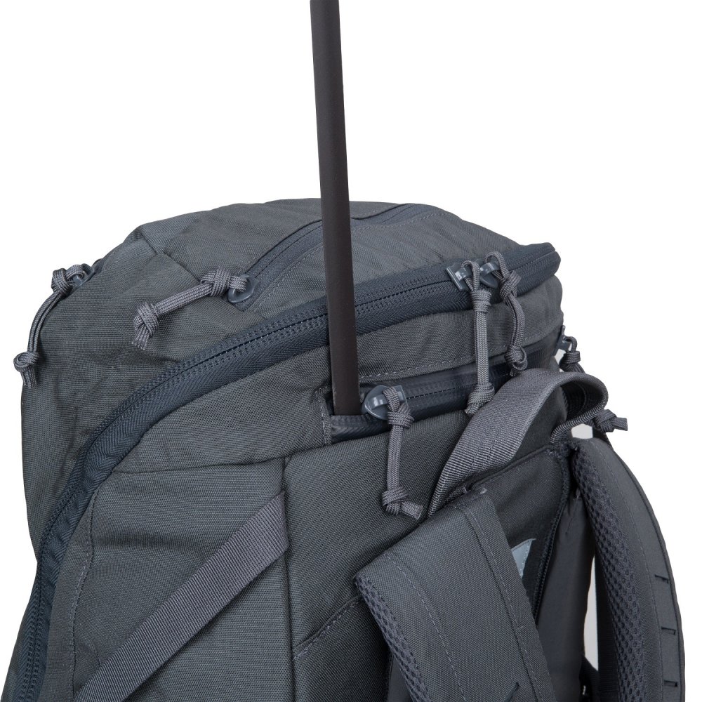 Vonkajšia strana je pokrytá laser cut MOLLE/PALS systémom. Na vrchnej časti sa nachádzajú dve vrecká – jedno z nich podšité velúrom. Robustné ramenné popruhy zaisťujú rozloženie záťaže a stabilitu pri nosení. Zosilnená konštrukcia a kotviace body umožňujú použitie batohu aj pri výsadkových operáciách.